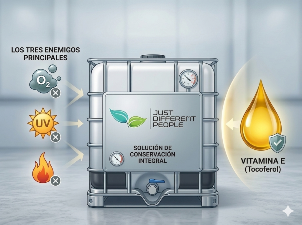 - Solución: Nunca guardar aceites en envases transparentes expuestos a luz natural o fluorescente intensa. En Just Different People priorizamos la utilización de bidones metálicos opacos o IBCs con protección UV para grandes cantidades, ya que estos actúan como barrera física.